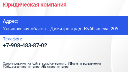 Юридическая компания по адресу Ульяновская область, Димитровград, Куйбышева, 205 в дальнейшем Организация, размещена в следующих категориях: