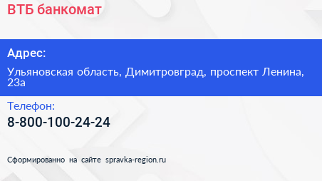 ВТБ, банкомат по адресу Ульяновская область, Димитровград, проспект Ленина, 23а в дальнейшем Организация, размещена в следующих категориях: