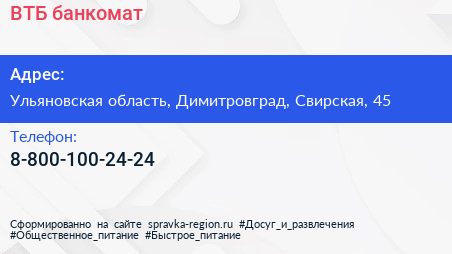 ВТБ, банкомат по адресу Ульяновская область, Димитровград, Свирская, 45 в дальнейшем Организация, размещена в следующих категориях: