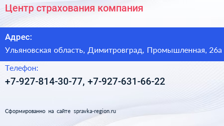 Центр страхования, компания по адресу Ульяновская область, Димитровград, Промышленная, 26а в дальнейшем Организация, размещена в следующих категориях:
