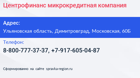 Центрофинанс, микрокредитная компания по адресу Ульяновская область, Димитровград, Московская, 60Б в дальнейшем Организация, размещена в следующих категориях: