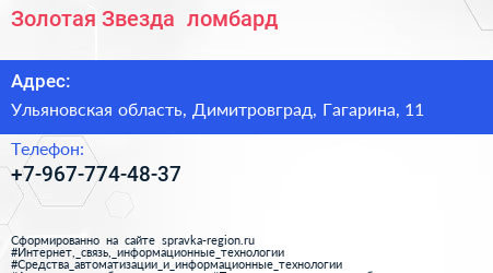 Золотая Звезда+, ломбард по адресу Ульяновская область, Димитровград, Гагарина, 11 в дальнейшем Организация, размещена в следующих категориях: