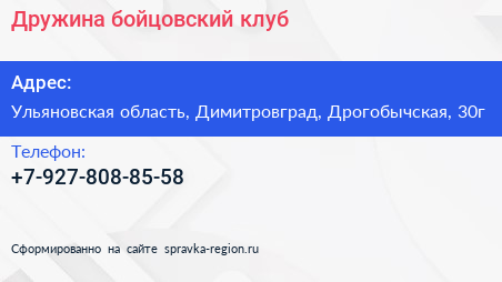 Дружина, бойцовский клуб по адресу Ульяновская область, Димитровград, Дрогобычская, 30г в дальнейшем Организация, размещена в следующих категориях: