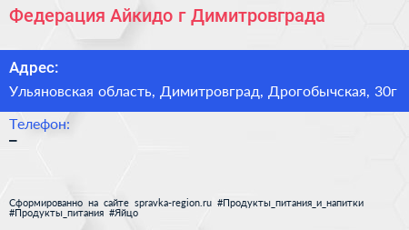 Федерация Айкидо г. Димитровграда по адресу Ульяновская область, Димитровград, Дрогобычская, 30г в дальнейшем Организация, размещена в следующих категориях: