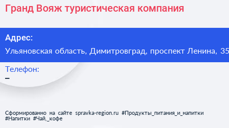 Гранд Вояж, туристическая компания по адресу Ульяновская область, Димитровград, проспект Ленина, 35 в дальнейшем Организация, размещена в следующих категориях: