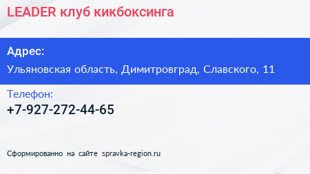 LEADER, клуб кикбоксинга по адресу Ульяновская область, Димитровград, Славского, 11 в дальнейшем Организация, размещена в следующих категориях: