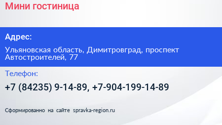 Мини-гостиница по адресу Ульяновская область, Димитровград, проспект Автостроителей, 77 в дальнейшем Организация, размещена в следующих категориях: