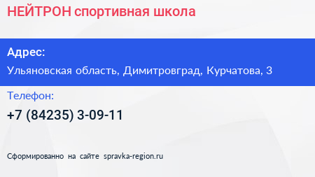 НЕЙТРОН, спортивная школа по адресу Ульяновская область, Димитровград, Курчатова, 3 в дальнейшем Организация, размещена в следующих категориях: