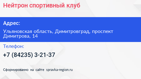 Нейтрон, спортивный клуб по адресу Ульяновская область, Димитровград, проспект Димитрова, 14 в дальнейшем Организация, размещена в следующих категориях: