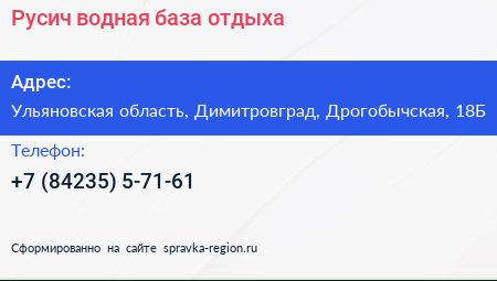 Русич, водная база отдыха по адресу Ульяновская область, Димитровград, Дрогобычская, 18Б в дальнейшем Организация, размещена в следующих категориях: