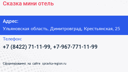 Сказка, мини-отель по адресу Ульяновская область, Димитровград, Крестьянская, 25 в дальнейшем Организация, размещена в следующих категориях: