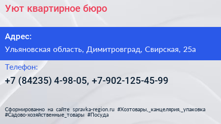 Уют, квартирное бюро по адресу Ульяновская область, Димитровград, Свирская, 25а в дальнейшем Организация, размещена в следующих категориях: