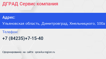 ДГРАД-Сервис, компания по адресу Ульяновская область, Димитровград, Хмельницкого, 100а в дальнейшем Организация, размещена в следующих категориях: