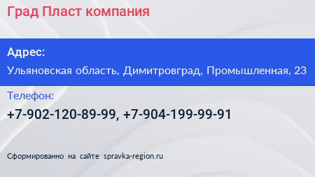 Град-Пласт, компания по адресу Ульяновская область, Димитровград, Промышленная, 23 в дальнейшем Организация, размещена в следующих категориях: