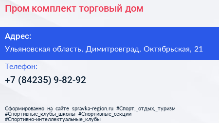 Пром-комплект, торговый дом по адресу Ульяновская область, Димитровград, Октябрьская, 21 в дальнейшем Организация, размещена в следующих категориях: