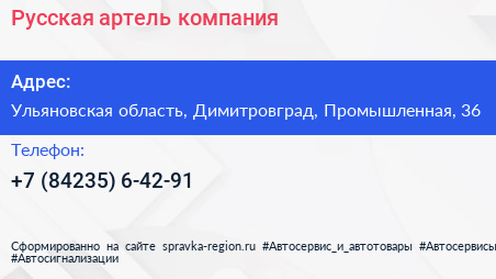 Русская артель, компания по адресу Ульяновская область, Димитровград, Промышленная, 36 в дальнейшем Организация, размещена в следующих категориях: