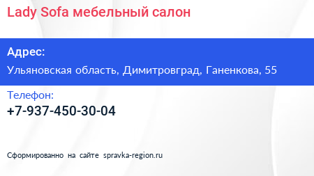 Lady Sofa, мебельный салон по адресу Ульяновская область, Димитровград, Ганенкова, 55 в дальнейшем Организация, размещена в следующих категориях: