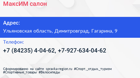 МаксИМ, салон по адресу Ульяновская область, Димитровград, Гагарина, 9 в дальнейшем Организация, размещена в следующих категориях: