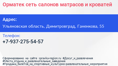 Орматек, сеть салонов матрасов и кроватей по адресу Ульяновская область, Димитровград, Ганенкова, 55 в дальнейшем Организация, размещена в следующих категориях: