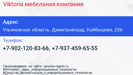 Viktoria, мебельная компания по адресу Ульяновская область, Димитровград, Куйбышева, 226 в дальнейшем Организация, размещена в следующих категориях: