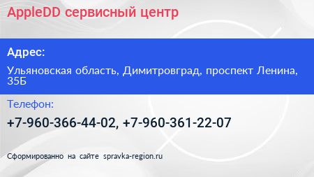 AppleDD, сервисный центр по адресу Ульяновская область, Димитровград, проспект Ленина, 35Б в дальнейшем Организация, размещена в следующих категориях: