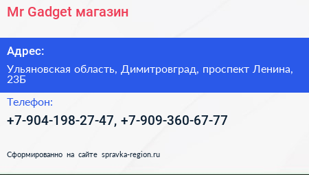 Mr.Gadget, магазин по адресу Ульяновская область, Димитровград, проспект Ленина, 23Б в дальнейшем Организация, размещена в следующих категориях: