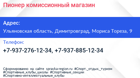 Пионер, комиссионный магазин по адресу Ульяновская область, Димитровград, Мориса Тореза, 9 в дальнейшем Организация, размещена в следующих категориях: