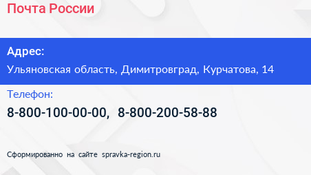 Почта России по адресу Ульяновская область, Димитровград, Курчатова, 14 в дальнейшем Организация, размещена в следующих категориях: