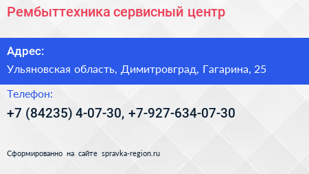 Рембыттехника, сервисный центр по адресу Ульяновская область, Димитровград, Гагарина, 25 в дальнейшем Организация, размещена в следующих категориях:
