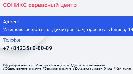 СОНИКС, сервисный центр по адресу Ульяновская область, Димитровград, проспект Ленина, 14 в дальнейшем Организация, размещена в следующих категориях: