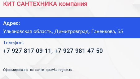 КИТ-САНТЕХНИКА, компания по адресу Ульяновская область, Димитровград, Ганенкова, 55 в дальнейшем Организация, размещена в следующих категориях: