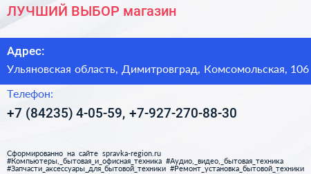ЛУЧШИЙ ВЫБОР, магазин по адресу Ульяновская область, Димитровград, Комсомольская, 106 в дальнейшем Организация, размещена в следующих категориях: