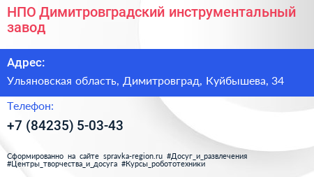 НПО Димитровградский инструментальный завод по адресу Ульяновская область, Димитровград, Куйбышева, 34 в дальнейшем Организация, размещена в следующих категориях: