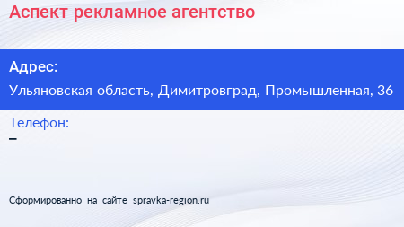 Аспект, рекламное агентство по адресу Ульяновская область, Димитровград, Промышленная, 36 в дальнейшем Организация, размещена в следующих категориях: