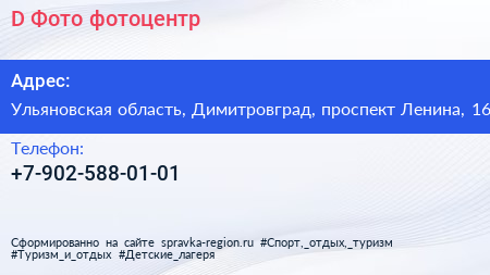 D-Фото, фотоцентр по адресу Ульяновская область, Димитровград, проспект Ленина, 16 в дальнейшем Организация, размещена в следующих категориях: