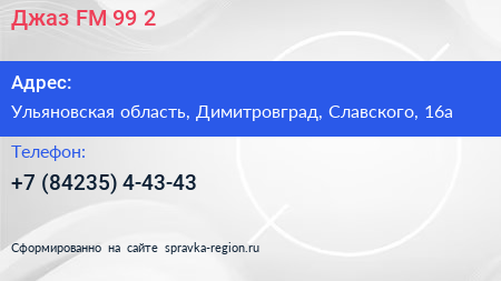 Джаз, FM 99.2 по адресу Ульяновская область, Димитровград, Славского, 16а в дальнейшем Организация, размещена в следующих категориях:
