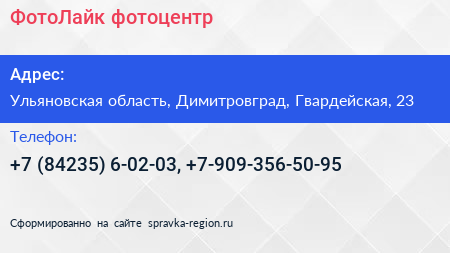 ФотоЛайк, фотоцентр по адресу Ульяновская область, Димитровград, Гвардейская, 23 в дальнейшем Организация, размещена в следующих категориях: