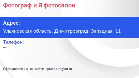 Фотограф и Я, фотосалон по адресу Ульяновская область, Димитровград, Западная, 11 в дальнейшем Организация, размещена в следующих категориях: