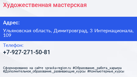 Художественная мастерская по адресу Ульяновская область, Димитровград, 3 Интернационала, 109 в дальнейшем Организация, размещена в следующих категориях: