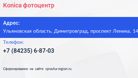 Konica, фотоцентр по адресу Ульяновская область, Димитровград, проспект Ленина, 14 в дальнейшем Организация, размещена в следующих категориях: