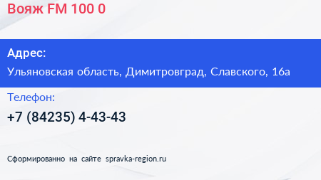 Вояж, FM 100.0 по адресу Ульяновская область, Димитровград, Славского, 16а в дальнейшем Организация, размещена в следующих категориях: