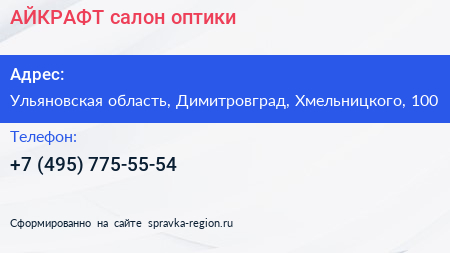АЙКРАФТ, салон оптики по адресу Ульяновская область, Димитровград, Хмельницкого, 100 в дальнейшем Организация, размещена в следующих категориях: