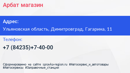 Арбат, магазин по адресу Ульяновская область, Димитровград, Гагарина, 11 в дальнейшем Организация, размещена в следующих категориях:
