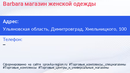 Barbara, магазин женской одежды по адресу Ульяновская область, Димитровград, Хмельницкого, 100 в дальнейшем Организация, размещена в следующих категориях: