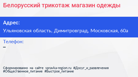 Белорусский трикотаж, магазин одежды по адресу Ульяновская область, Димитровград, Московская, 60а в дальнейшем Организация, размещена в следующих категориях: