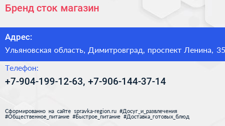 Бренд, сток-магазин по адресу Ульяновская область, Димитровград, проспект Ленина, 35 в дальнейшем Организация, размещена в следующих категориях: