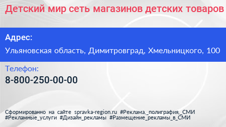 Детский мир, сеть магазинов детских товаров по адресу Ульяновская область, Димитровград, Хмельницкого, 100 в дальнейшем Организация, размещена в следующих категориях: