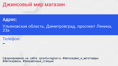 Джинсовый мир, магазин по адресу Ульяновская область, Димитровград, проспект Ленина, 23а в дальнейшем Организация, размещена в следующих категориях: