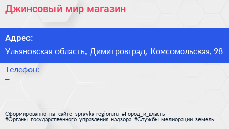 Джинсовый мир, магазин по адресу Ульяновская область, Димитровград, Комсомольская, 98 в дальнейшем Организация, размещена в следующих категориях: