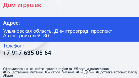 Дом игрушек по адресу Ульяновская область, Димитровград, проспект Автостроителей, 30 в дальнейшем Организация, размещена в следующих категориях: